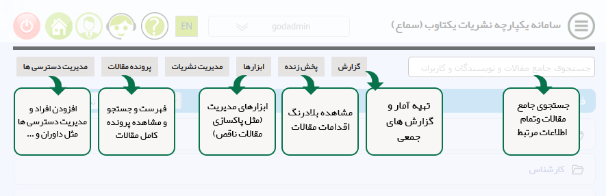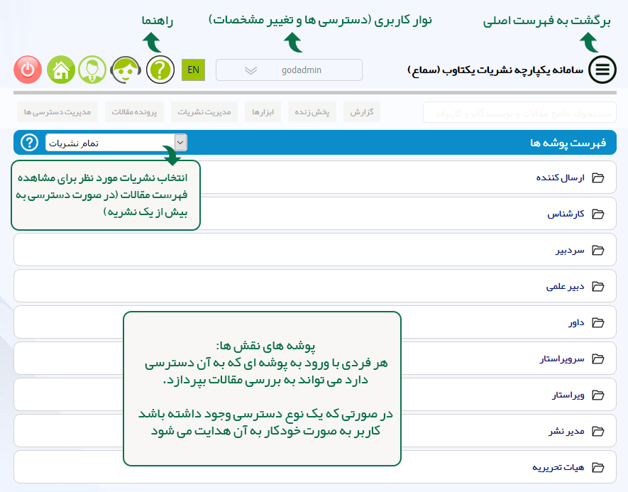 معرفی سامانه سبا سامانه یکپارچه اسناد یکتاوب تحت مجموعه عمومی سماع عرضه می شود و امکان دریافت، رهگیری، بررسی و انتشار مقالات را به صورت یکپارچه و هدفمند فراهم می کند. این سامانه به هر فرد تنها یک نام کاربری و رمز عبور اختصاص می دهد و با همان نام کاربری می تواند به همه نقش های خود در همه نشریات دسترسی داشته باشد. توضیحات هر بخش از این سامانه در تصاویر زیر ارایه شده است.نسخه اولیه این سامانه برای مقالات عرضه شده است. اما با داشتن امکان تغییر و تنظیم نقش ها و عناوین، امکان استفاده از آن برای بررسی هر نوع سندی وجود خواهد داشت.