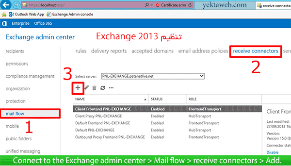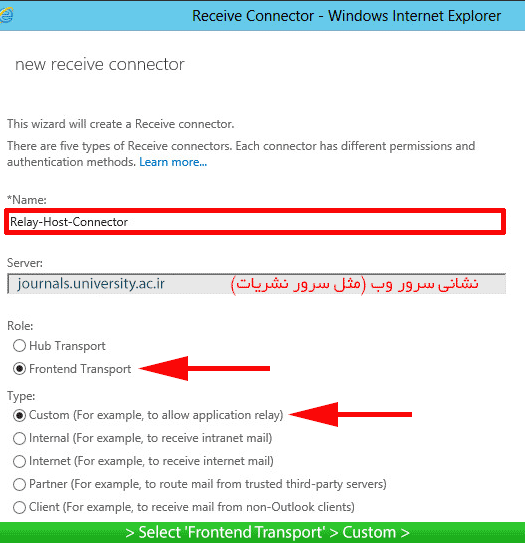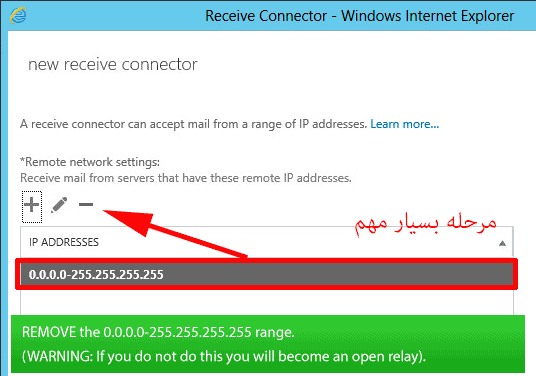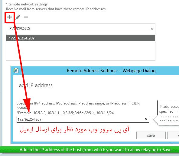 راهنمای تنظیم سرورهای Exchange: نرم افزار Microsoft Exchange این امکان را دارد که ارسال ایمیل را از آی پی های خاصی محدود کنید. برای تنظیم انواع نسخه ها به صورت زیر عمل کنید. دقت کنید که آی پی وب سرور را درست وارد کنید (مثلا اگر هر دو سرور میل و وب در شبکه محلی هستند آی پی داخلی آن ها را استفاده کنید و اگر در بیرون از شبکه محلی همدیگر را می بینند آی پی خارجی را تنظیم کنید) در راهنمای زیر تنظیم چند آی پی یک یا چند سرور توضیح داده شده است. اگر شما فقط یک سرور و آی پی دارید فقط برای یک آی پی انجام دهید.
