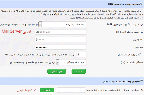 3- اگر سایت شما روی سرور سازمان نصب شده باشد: در این حالت نیز اگر سازمان شما که مالک دامنه ی اصلی هست اجازه ندهد، ایمیل های ارسالی از سرور جعلی تلقی شده و اسپم می شوند یا برگشت می خورند. یا اصولا ی ارسال ایمیل در شبکه مسدود شده است. پس باید اطلاعات mail server را از سازمان دریافت کنید و در بخش تنظیمات پست الکترونیک در بخش تنظیمات smtp وارد کنید.