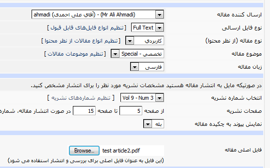بخش مقالات | تنظیمات ویژه مقالات | تنظیم کادرها و امکانات فعال در فرم ارسال مقاله، ارسال ایمیل به کاربر، مراحل بررسی مقالات، وضعیت های مقالات، فایل های اصلی فعال برای ارسال و توضیحات کادرهای ارسال فایل، |