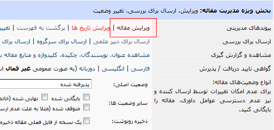 توضیح: البته اگر با برنامه یکتاوب مقالات را از کاربران دریافت کنید دیگر نیازی به ورود مجدد اطلاعات مقالات نیست و می توانید با ورود به پرونده مقاله، همان مقاله قبلی را ویرایش کرده و فایل PDF را جایگزین کرده و منتشر کنید.